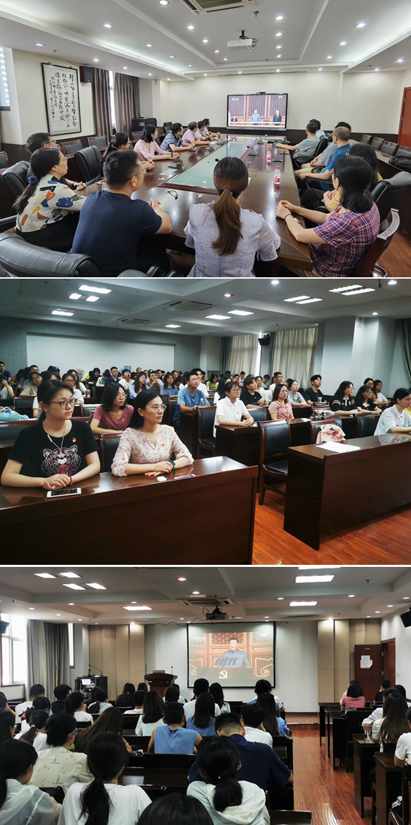师生党员代表在理科楼C303、C305、C306三个会场集中观看大会实况直播,各党支部采用线上与线下相结合的方式通过电视、广播、网络、手机客户端等媒体,组织党员收听收看。会后,学院领导班子、各党支部组织开展专题学习,深入学习习近平总书记的重要讲话精神。