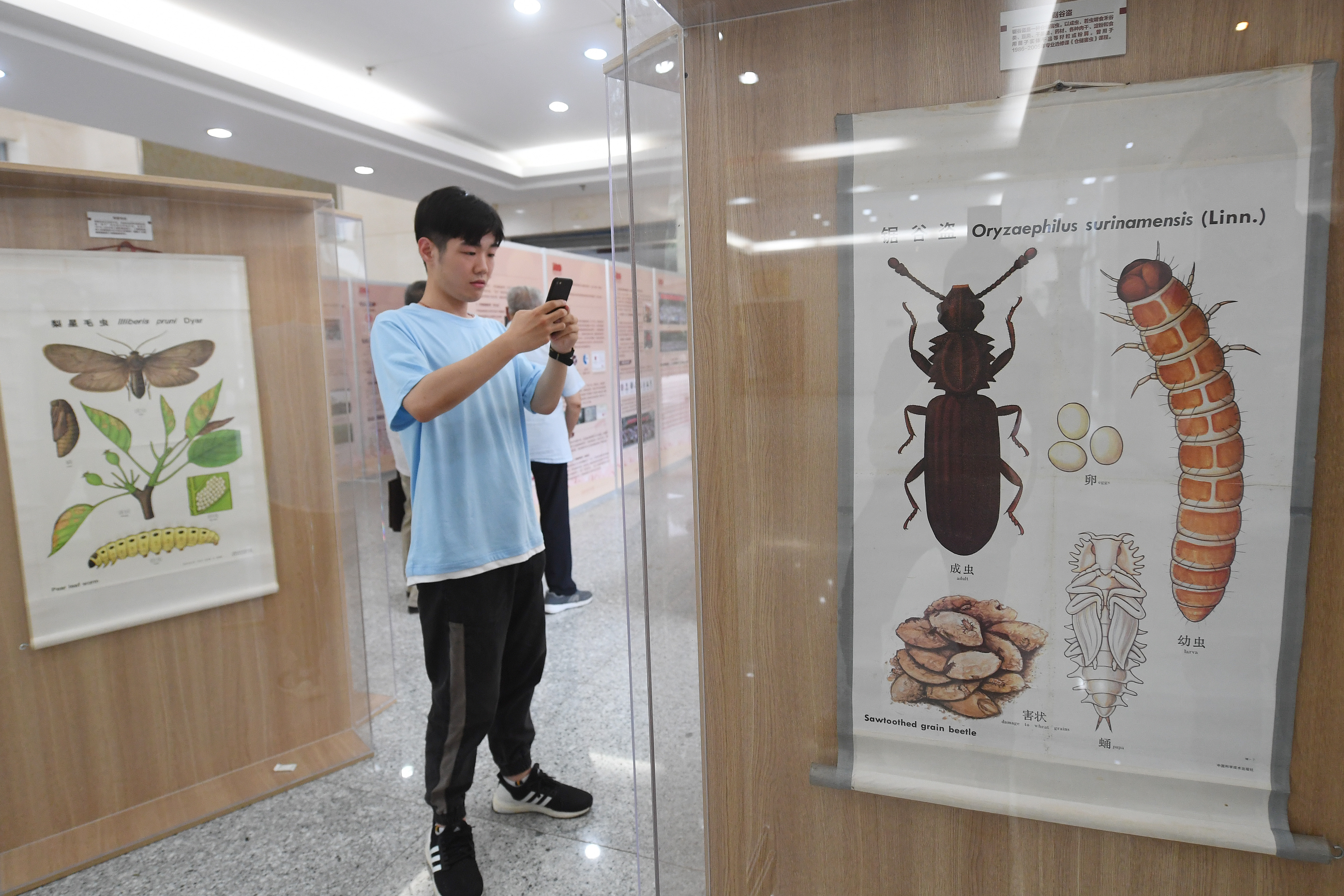 两台上世纪中叶的显微镜,多幅精美的教学挂图,吸引了许多参观者驻足拍摄。据介绍,1952年全国院系调整,成立南京农学院,下设植物保护系,建系初期办学条件艰苦,显微镜仅有48台,但师生克服困难建基立业,全面推进院系建设。而教学挂图部分为上世纪七八十年代教师手绘,广泛用于学生课堂教学和社会人员农技培训。