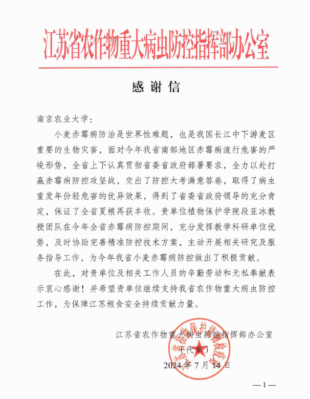 段亚冰教授团队在今年江苏省赤霉病防控期间做出的积极贡献表示感谢。