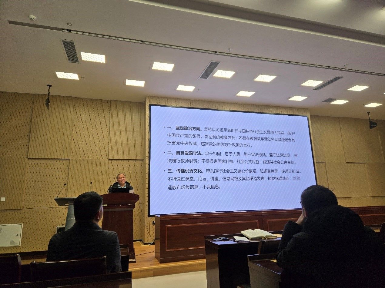 随后,张正光部署新学期工作。他从教育教学、科学研究、安全管理及学生工作等方面作了工作部署。在教育教学方面,他要求全体教师要全面自检自查教学工作漏洞,抓牢抓实课堂教学质量,打造精品课程,用心编写教材,推进学科高质量发展;在科研工作方面,他强调各个团队要迎难而上,推动科研重点攻关,积极申报重点研发计划和基金项目,落实目标管理相关责任;在安全管理方面,他要求各实验室与公共实验平台继续加强安全管理,严格规范落实,创造安全有序的教学、科研环境;在学生工作方面,他希望全体教师要关心关爱学生,注重学生心理健康工作,加强考风考纪和诚信教育,鼓励学生积极参加课外科技竞赛等全国赛事,做好本研学生就业指导与服务工作。同时,张正光带领全体教职工认真学习《新时代教师职业行为十项准则》,引导广大教师努力成为有理想信念、有道德情操、有扎实学识、有仁爱之心的好老师。