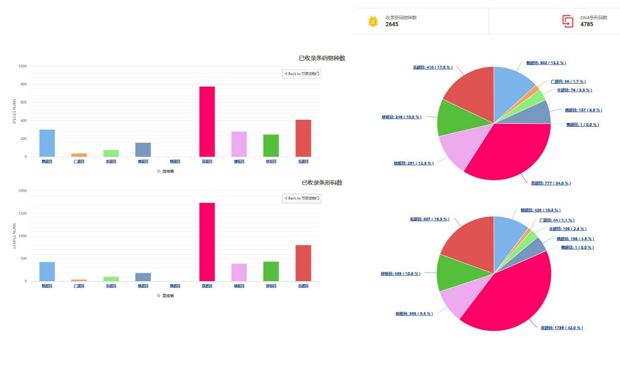 数据库已上传条形码物种:2645种,条形码数量:4785条,线粒体基因组:341个。数据库整合了同一物种的分类、分子条形码、地理分布以及不同虫态形态图像等信息,有利于物种的精准鉴定。同时支持分类阶元、关键词、地理分布等三种不同方式的信息检索,支持按筛选条件检索和结果排序,方便用户查找需要的数据资源。