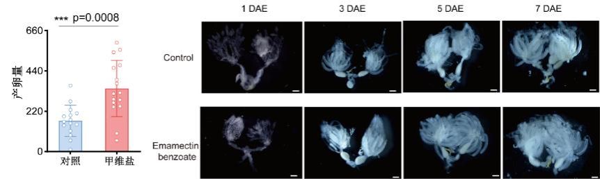 研究发现,经亚致死剂量农药处理后,褐飞虱雌虫的卵巢发育速度明显加快,体内成熟卵的数量大幅增加,最终单雌产卵量比没接触农药的对照组显著提高。这意味着,少量农药不仅没抑制害虫繁殖,反而成了它们的 “繁殖加速器”(图1)。