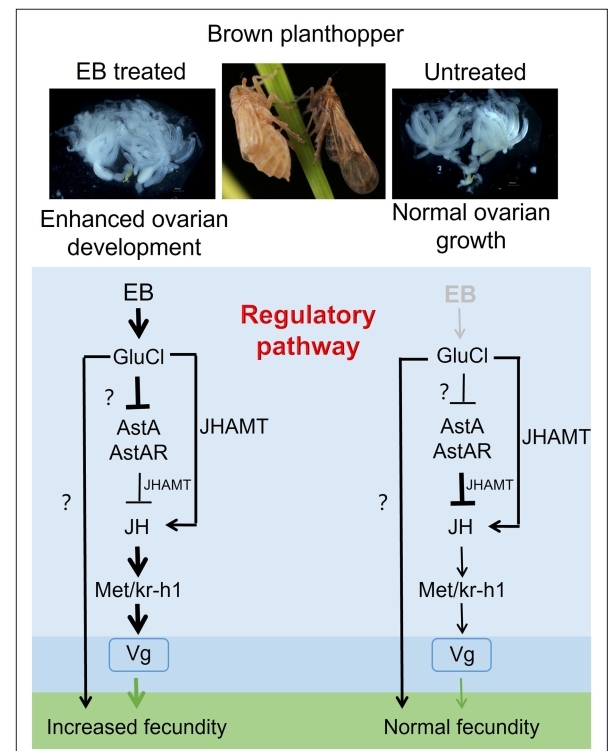 保幼激素是昆虫体内调控生长发育和繁殖的重要激素,对雌虫卵巢发育、卵的成熟至关重要。实验发现,接触亚致死剂量农药后,褐飞虱雌虫体内的保幼激素含量明显升高。同时,与保幼激素合成相关的基因 JHAMT,以及传递保幼激素信号的基因 Kr-h1,其活性也显著增强。