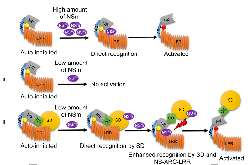 “迄今为止,绝大多数植物胞内免疫受体蛋白都使用单一的感知功能域来识别病原效应蛋白,通俗的说就是一次识别之后就会启动防御反应,Sw-5b已经能够通过NB-ARC-LRR结构域识别病毒效应蛋白,为什么还要多此一举,再进化出一个额外的感知结构域识别病毒效应蛋白?”带着这样的疑问,研究人员深入研究发现,Sw-5b NB-ARC-LRR结构域实际上是个“多面手”,同时扮演“探测器”和“分子开关”的角色,它既能够探测识别病毒效应蛋白又能够开启植物防御系统诱导植物产生过敏性坏死反应,而Sw-5b SD结构域则作为另一个“探测器”去感知细胞中是否有病原菌的效应分子存在。虽然NB-ARC-LRR也能感知细胞中的病毒效应蛋白,但是这个“多面手”监测病毒的灵敏度并不高,当细胞中病毒效应蛋白NSm浓度很低时,NB-ARC-LRR不能有效对其监测。令人惊奇的是,Sw-5b SD探测器能显著增强NB-ARC-LRR对低浓度的NSm的识别能力并促进其激活诱导强烈的防御反应。实验数据显示,当SD探测器存在时,NB-ARC-LRR能够结合更多的病毒效应蛋白。该研究论文第一作者李佳博士给记者做了一番形象的描述:“Sw-5b N末端的SD结构域就像一个‘吸铁石’一样的探测器,即使细胞中病毒的效应蛋白浓度很低,SD探测器也能够将它吸附过来,形成富集效应,然后再将富集起来的病毒效应分子传递给NB-ARC-LRR这个探测器和分子开关,分子开关进行第二次识别验证无误后随即启动植物的防御反应,这样看来Sw-5b 通过采取两步识别的机制来提高监测病原物的特异性和灵敏度是非常巧妙的。”