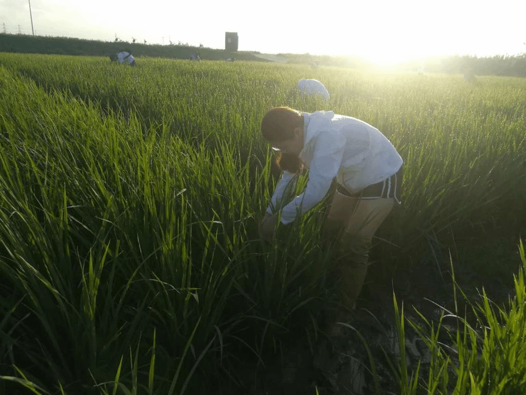 第二天,同学们迎着清晨的第一缕阳光,在几位老师的带领下前往稻田,实习正式拉开序幕。一部分同学穿上护具,拿着工具在水稻田中对病虫害情况进行细致的统查;另一部分同学则在田边收集各类昆虫和病叶标本。同学们在实验室利用解剖镜和显微镜等工具,通过查阅相关的资料,鉴定昆虫和病原物。组员和组间,分工明确,相互协作。