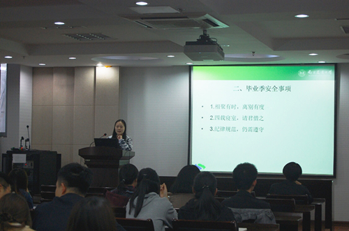 辅导员李艳丹主持,全体2014级毕业生参加。会议强调了临近毕业时应该注意的安全事项与档案问题。