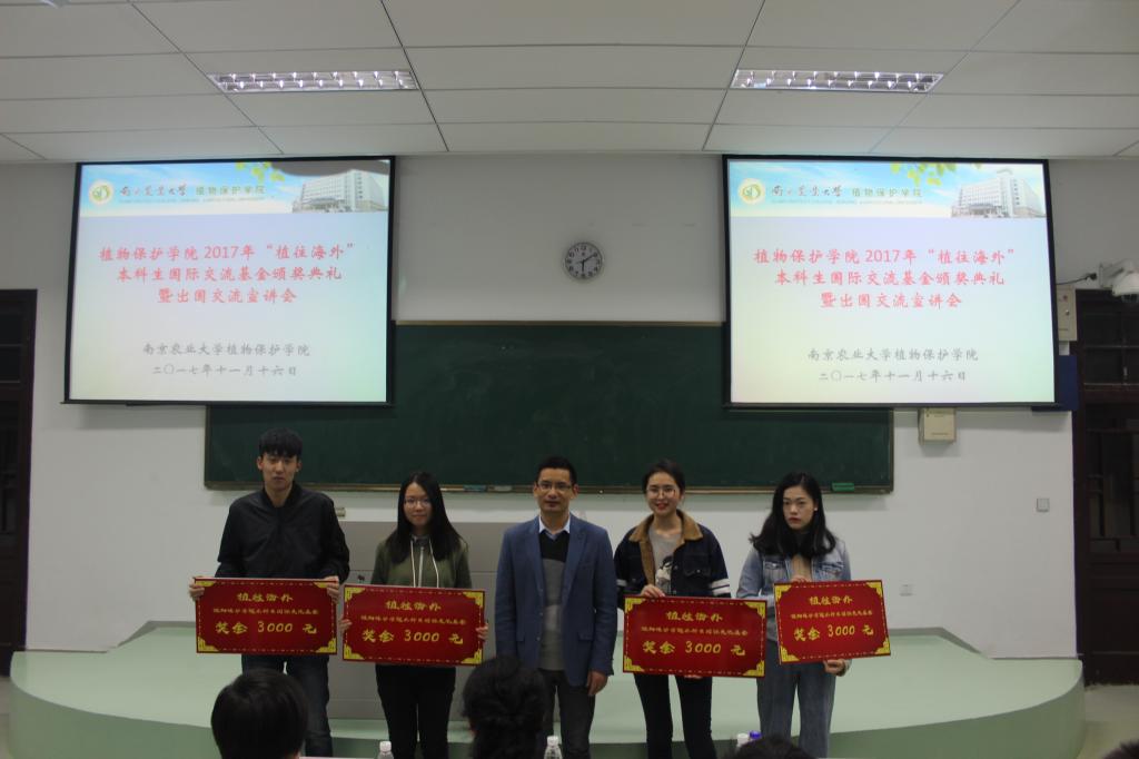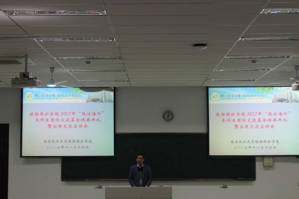 颁奖结束,由童院长上台为大家做说明。她首先提到了中国当代大学生的留学现状,着重强调出国留学的意义:1、自理自立2、读万卷书行万里路。接着分析了近五年来,植保留学生的情况,对各个留学项目都做了简要的说明。薛兰以己为例,上台讲述了自己的学习经验和访学经历。