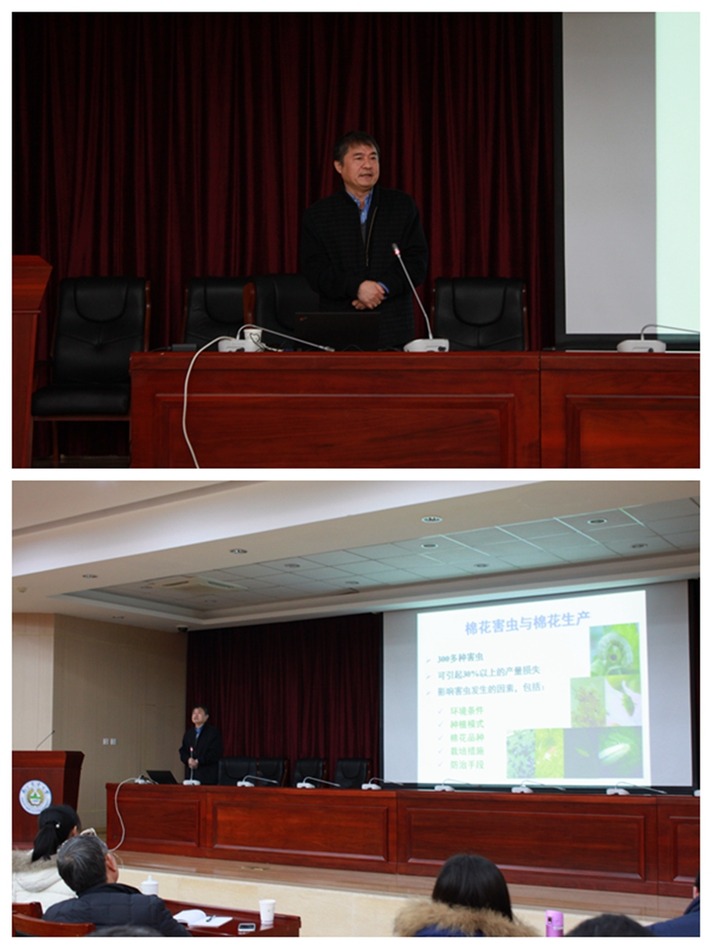 吴孔明院士现任中国农业科学院副院长、2006年获得国家杰出青年基金,2011年当选中国工程院院士。在题为“棉花害虫研究工作的回顾与体会”的报告中,他结合中国棉花病虫害研究工作的70年发展历程,深入浅出地阐述了棉花病虫害研究的阶段性成果,并提出棉铃虫种群如何演化、是否会出现抗性问题、天敌的生防服务功能如何变化、非靶标害虫种群如何演替、棉铃虫/微生物的协同进化五大问题,进而介绍其课题组在Bt棉花方向的研究进展。作为老一代科学家,吴院士倡导在座青年师生树立报效祖国信念、培养吃苦耐劳精神,珍惜现有优良科研环境,为我国农业发展做贡献。