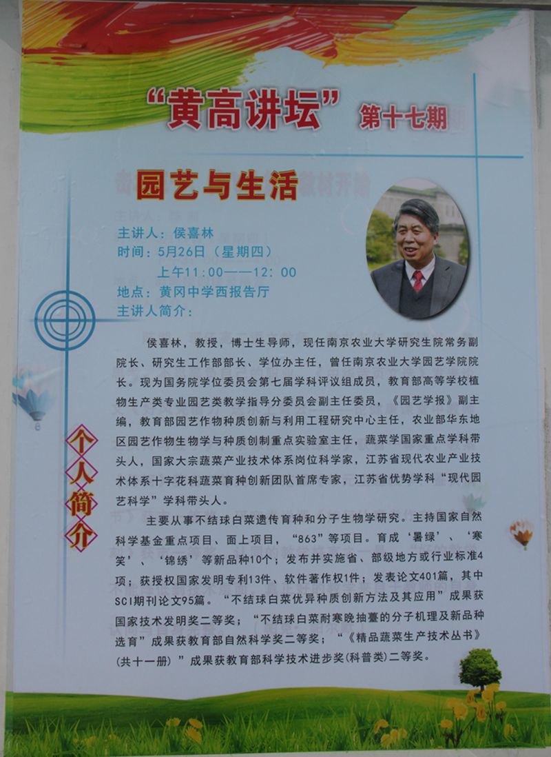 党委副书记黄绍华等应邀参观黄冈中学校史馆,并与工会主席王实泉、高三年级班主任进行座谈。侯喜林教授受邀做客学校“黄高讲坛”,为中学生做题为《园艺与生活》的专题讲座。