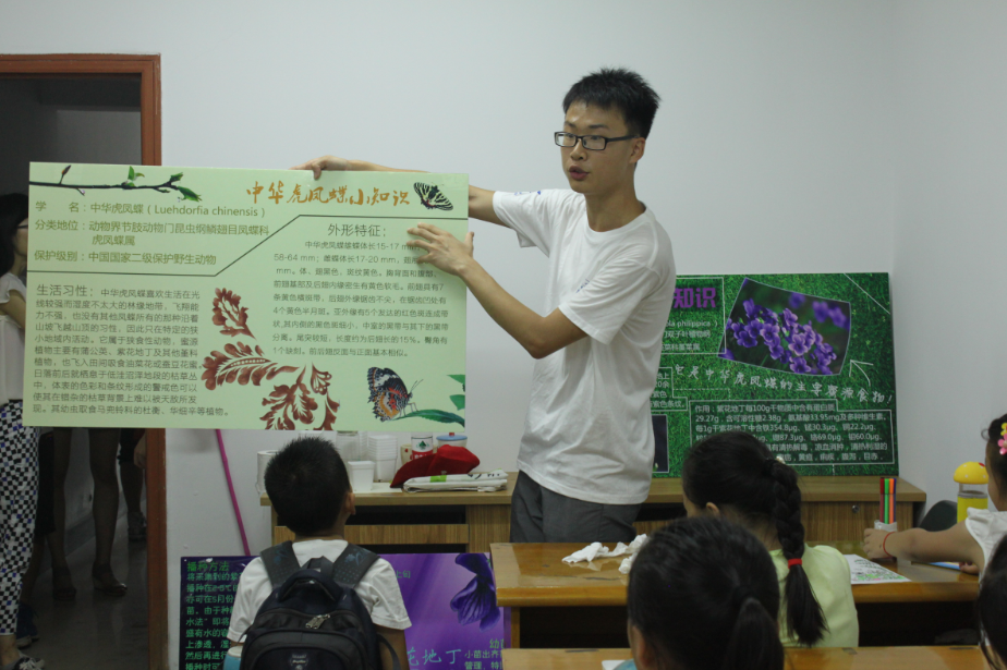 “中华虎凤蝶护卫队”实践团的同学还给高家库社区夏令营的孩子们带去了一堂别开生面的“护蝶课”。课上,志愿者向孩子们重点介绍了国家二级保护动物——中华虎凤蝶的生活习性和生存现状,并给孩子们发放中华虎凤蝶蜜源植物——紫花地丁的种子,教授其种植方法,呼吁孩子们以实际行动来保护中华虎凤蝶。活动过程中,孩子们对虎凤蝶表现出了极大的兴趣和求知欲,纷纷举起小手提问。南农的同学们亦用通俗易懂的言语一一进行了解答。