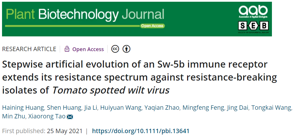 陶小荣教授团队在植物学知名期刊《Plant Biotechnology Journal》发表题为《Stepwise artificial evolution of an Sw-5b immune receptor extends its resistance spectrum against resistance-breaking isolates of Tomato spotted wilt virus》的研究论文,该研究采用逐步人工进化的策略,筛选鉴定了大量抗病基因突变体,获得了对TSWV田间抗性突破株系具有良好抗病作用的Sw-5b抗病基因新材料。