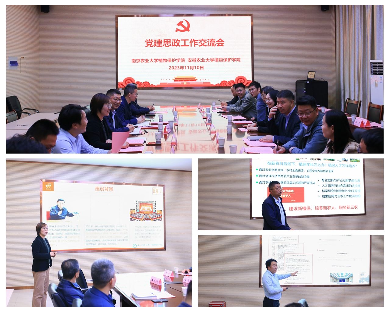 随后,双方人员分别参加党建思政工作交流和学术交流报告会两个分会场活动。在党建思政工作交流会现场,刘柳、汪小强、唐庆峰分别介绍了安农植保学院党建工作、思政工作、学院人才培养工作情况,双方围绕重点工作展开交流。