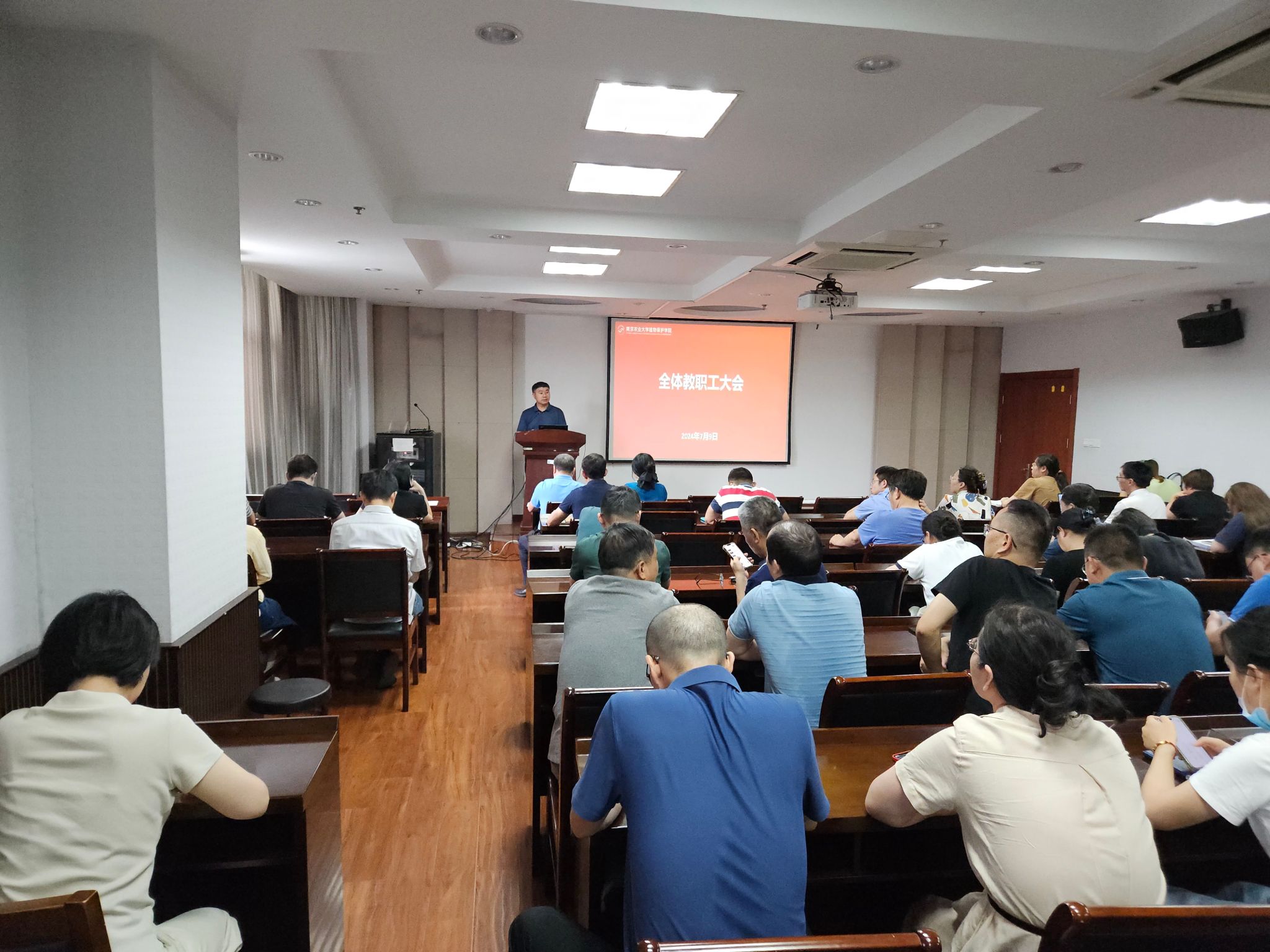 在理科楼C303会议室召开全院教职工大会,学院领导班子及全院教职工参加会议,会议由学院党委书记许承保主持。