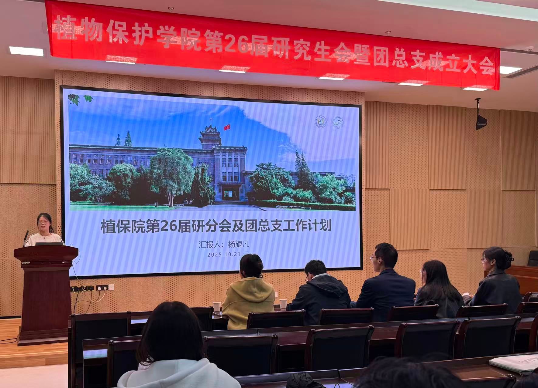 接着,学院第26届研分会主席团成员杨旎凡作工作计划报告。她介绍了院研会及团总支的组织架构、新学年各部门的工作规划,并号召大家协同合作,共建一个更具积极性与活力的研究生会,一起全心全意为本院研究生服务。