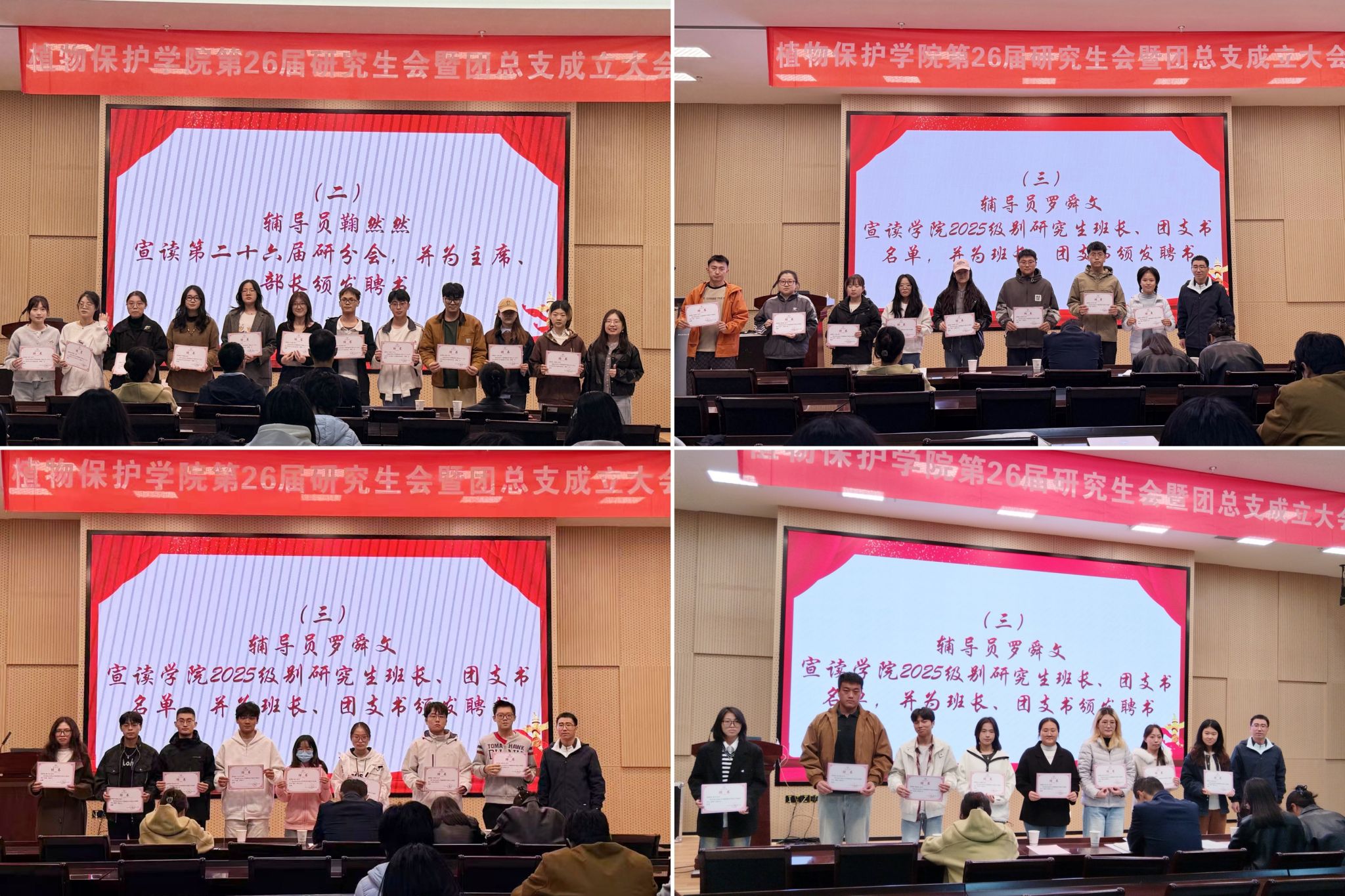 随后,鞠然然宣读新一届院研会及团总支成员名单,并为新一届院研会主席团成员、部长颁发聘书。罗舜文宣读学院2025级研究生新生班长、团支书名单,并颁发聘书。