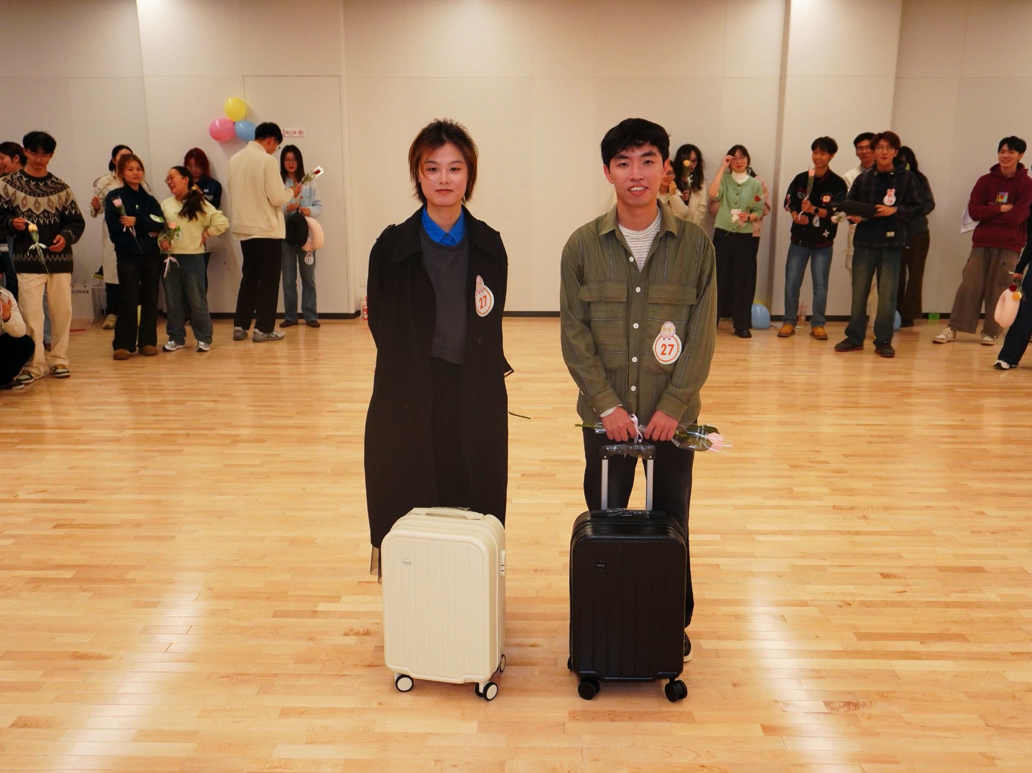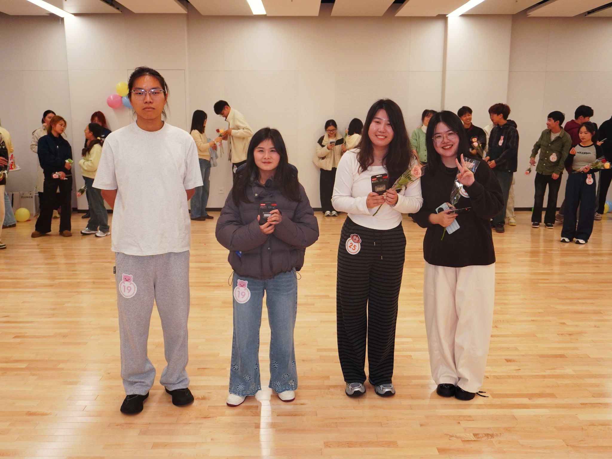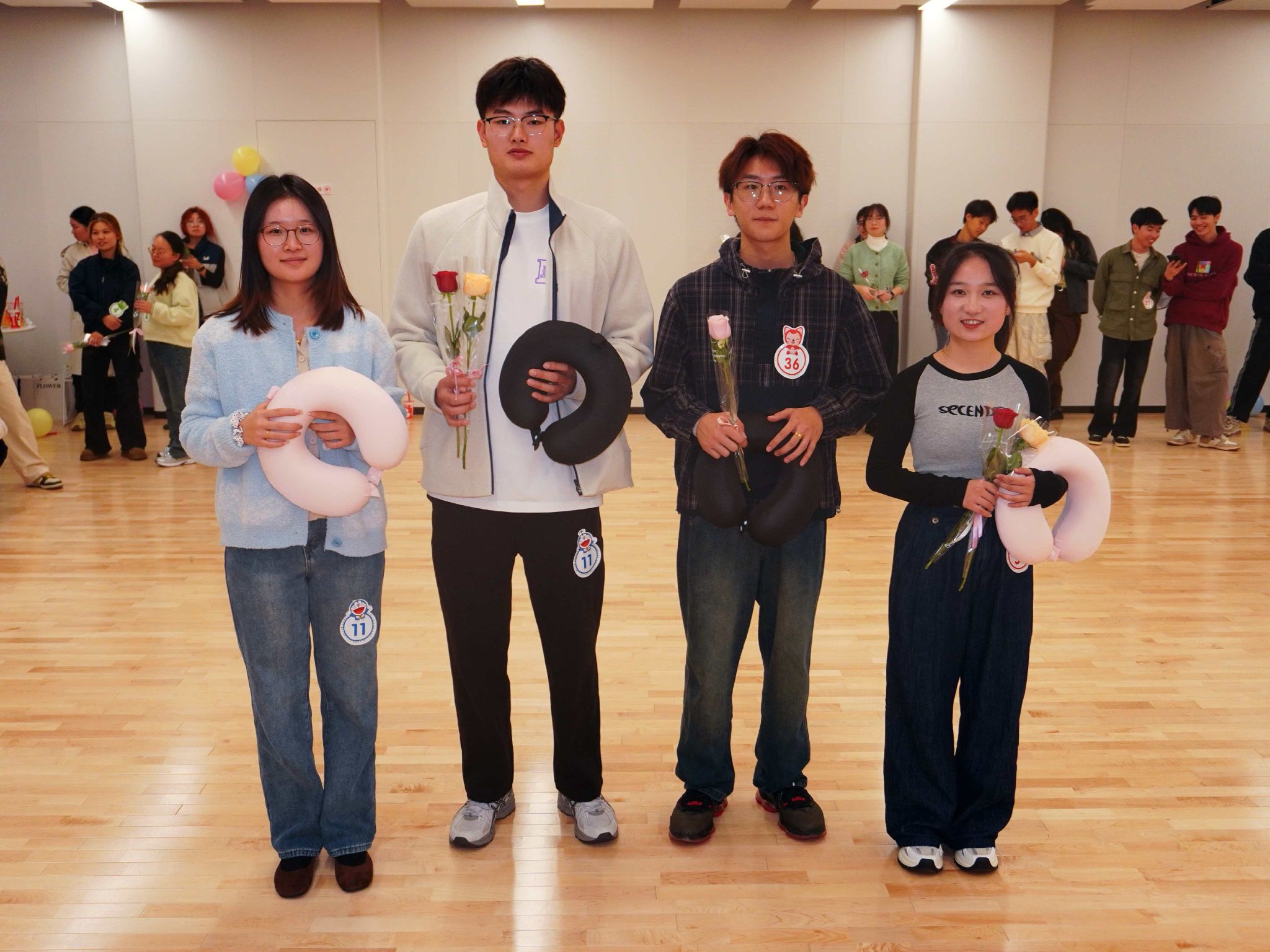 舞会现场以象征爱与美好的玫瑰花装点,与“舞缘玫好”的主题巧妙呼应,更为这场秋夜聚会注入了满满的活力。同学们或自带舞伴,或通过领取专属号码牌开启“惊喜盲盒”。