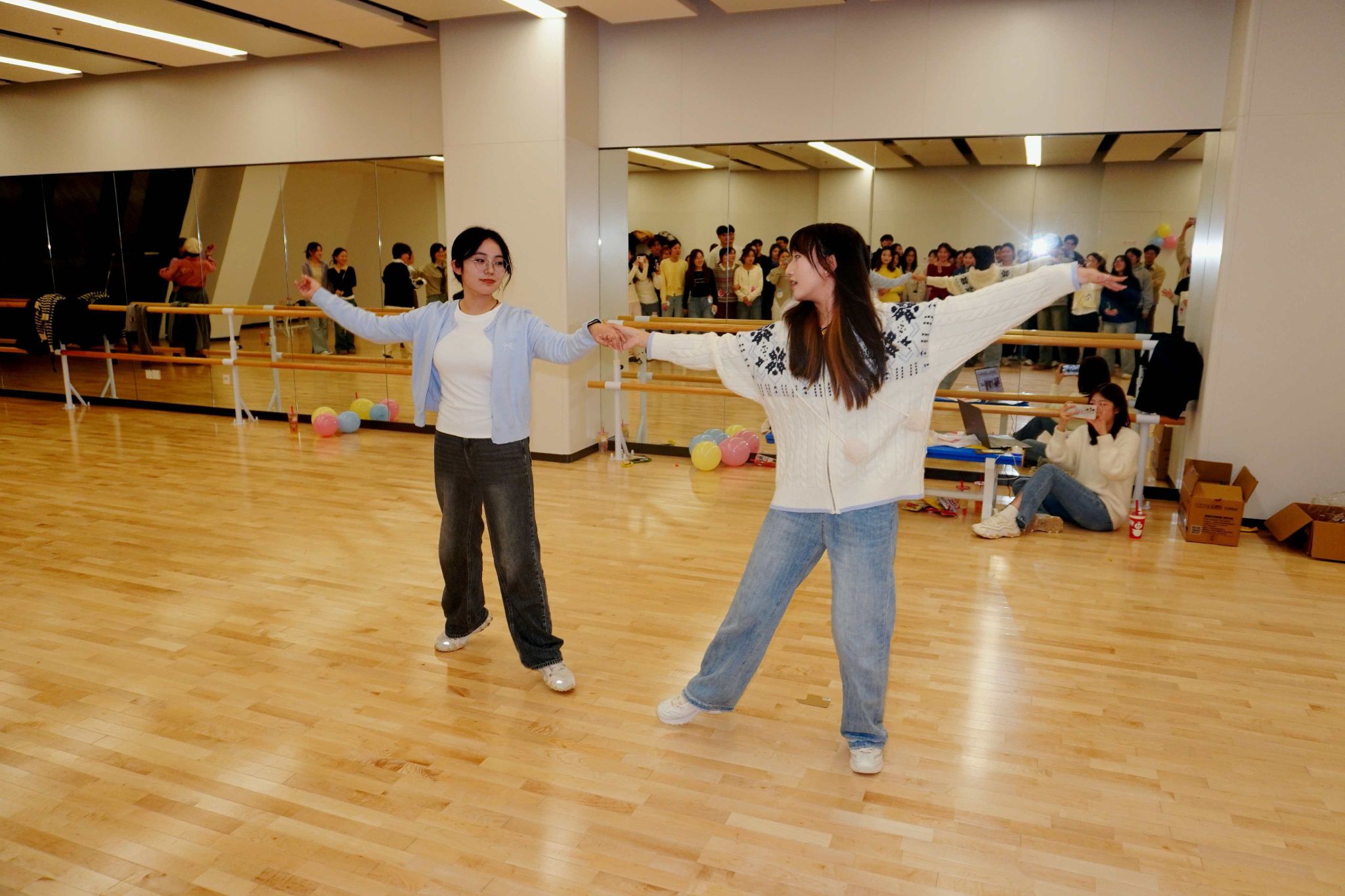 研究生易琦玮和李想同学耐心细致的《爱的华尔兹》教学环节,许多零基础的同学勇敢地迈出了第一步。他们携手旋转,步履从生涩到流畅,自信与优雅在舞步中悄然生长。
