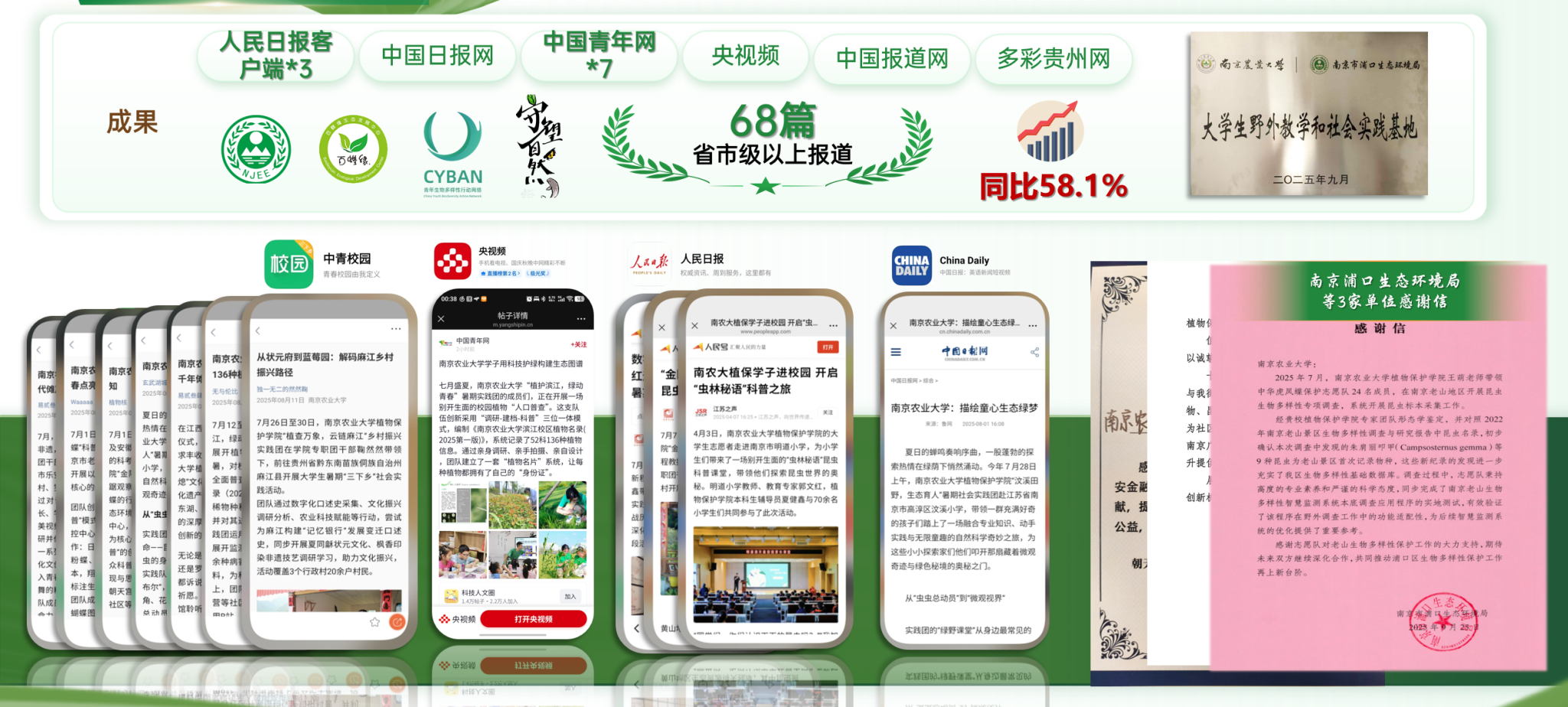 今年,学院获省市级优秀志愿者表彰5人次。学院收到浦口生态管理局等单位感谢信3封,服务对象反馈良好,合作单位评价积极。志愿服务工作获市级及以上媒体报道68篇次,包括人民日报客户端3篇、中国青年网7篇,以及中国日报网、央视频、中国报道网、多彩贵州网等主流媒体,全年累计媒体报道转发118篇次。