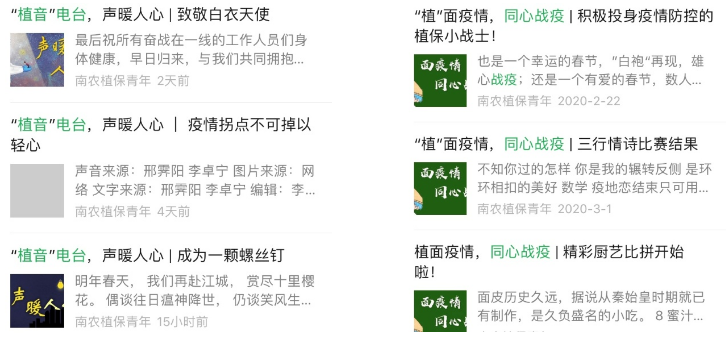 筑牢阵地,媒体宣传共聚力。在学院微信平台“南农植保青年”开辟“植”面疫情,同心战“疫”、“植音”电台,声暖人心、鼠你健康专栏,做好疫情防控网络宣传,加强舆论引导。累计发布推送50余条,总阅读量超过17000次,获微信平台“91短视频