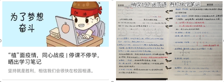 停课不停学,强化在线学风建设。通过晒学习笔记、学习打卡等方式,引导学生在“云开学”期间自主学习,树立良好学风,开展时间管理和学业规划。