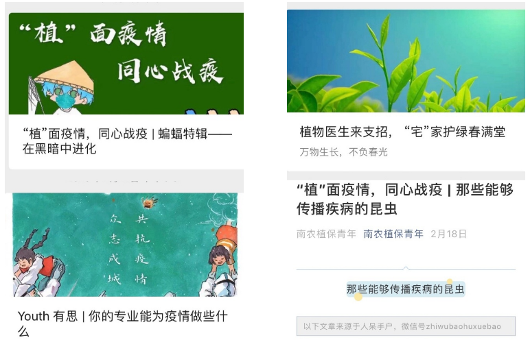 专业报国,植保力量助战“疫”。充分发挥学科优势,邀请学院专业教授进行线上指导,引导学生利用专业所学知识,结合疫情相关,制作春季植物养护、昆虫传播病害、生态多样性等相关科普推送。