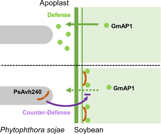 通过解析大豆疫霉菌致病因子PsAvh240的晶体结构,结合生物化学、分子生物学、细胞生物学等实验方法,揭示了PsAvh240以二聚体的形式定位在植物细胞膜上发挥毒性功能的分子机制。随后通过质谱分析鉴定到PsAvh240的互作蛋白是来自大豆的天冬氨酸蛋白酶GmAP1,并证明PsAvh240通过与GmAP1的互作来阻止GmAP1外泌到质外体发挥抗病功能。这项研究首次发现了植物天冬氨酸蛋白酶参与质外体免疫来抵御疫霉菌侵染,并且揭示了疫霉菌破坏植物质外体免疫的新策略,即疫霉菌可以向“敌后”—-植物细胞内分泌效应子来抑制植物天冬氨酸蛋白酶的外泌,拓宽了对植物与病原菌互作的认识。该研究还发现大豆天冬氨酸蛋白酶对不同疫霉菌均表现出抗病效果,为改良作物广谱抗性提供新的基因资源。