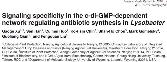 钱国良教授团队与江苏省农业科学院刘凤权研究员实验室合作在国际著名学术期刊Nucleic Acids Research(IF 11.561)在线发表了题为“Signaling specificity in the c-di-GMP-dependent network regulating antibiotic synthesis in Lysobacter”的研究论文。该研究首次在生防细菌--产酶溶杆菌OH11中发现了胞内核苷酸类第二信使c-di-GMP降解酶可以与其受体蛋白通过物理互作形成复合物来实现对下游信号的特异性传递,从而精确调控抗菌物质HSAF的生物合成。该研究也为通过遗传改良或代谢优化c-di-GMP信号途径来提升HSAF产量,开发基于HSAF的生物农药提供了新思路和途径。91短视频