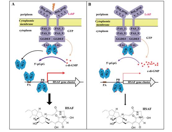LchP介导的c-di-GMP信号通路调控HSAF生物合成的工作模型
