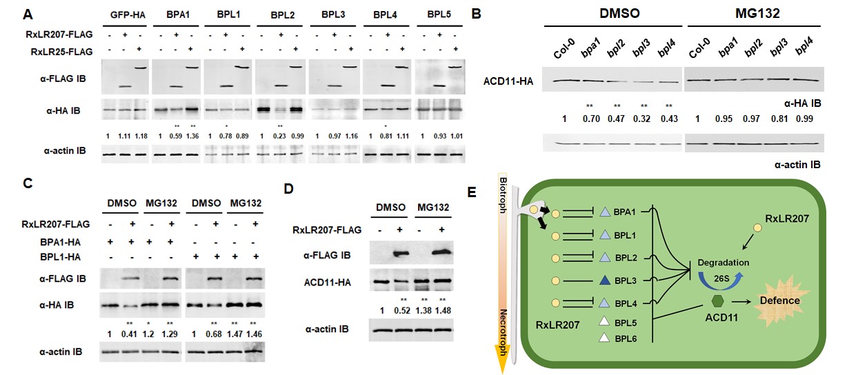 通过突变体表型分析,研究人员发现BPA1/BPLs能参与植物的防卫反应,降低寄主对辣椒疫霉菌的免疫力。其机制是通过稳定细胞中的ACD11来影响后者介导的活性氧爆发与细胞死亡等细胞学过程。同时,辣椒疫霉菌产生效应子RxLR207,以此干扰BPA1/BPLs的正常功能,促进病原菌活体阶段到死体阶段的转变,引起植物发病。该研究明确了辣椒疫霉菌一种精细的致病机理,在于RxLR207对于辣椒疫霉菌而言,是一种既不能缺失,又“过犹不及”的效应子。