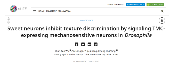 研究论文“Sweet neurons inhibit texture discrimination by signaling TMC-expressing mechanosensitive neurons in Drosophila”于2019年6月11日以长文形式出版在eLife杂志。吴顺凡博士是论文的第一作者和共同通讯作者,杜克大学Yang Chung-Hui博士是论文的共同通讯作者,91短视频