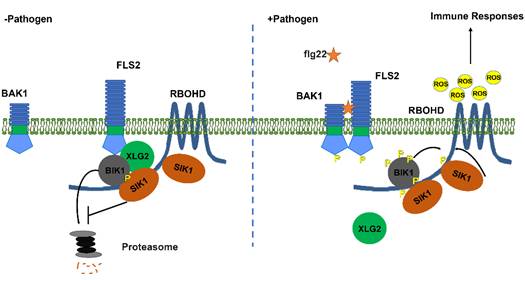 植物利用细胞表面的模式识别受体来感知病原菌的入侵,诱导抗性发生,其中活性氧迸发是一种重要抗病反应。活性氧迸发需要激活细胞质膜上的酶RBOHD,它负责催化氧化NADPH,是产生胞外活性氧的关键酶,但是目前对该酶的精细调控机制尚不明确。前期研究表明,类受体胞内蛋白激酶BIK1在植物抗病中起重要作用,它能在植物感知病原菌存在后,磷酸化并激活RBOHD来诱导活性氧的迸发。该研究鉴定到一个新的蛋白激酶SIK1,表明它是抗病信号途径中的另外一个关键因子,它能磷酸化并稳定BIK1来促进BIK1的活性,也能直接与RBOHD互作,并通过磷酸化来激活其活性。因此,该研究发现SIK1是一个新的植物核心免疫调节因子,并揭示了其激活RBOHD促进活性氧迸发的分子机制。