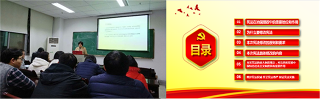2018年12月27日,支部组织党员们进行了《宪法》的学习。支部副书记赵珊带领党员从宪法的重要地位和作用、为什么修改宪法、本次修改原则和内容等六个方面进行了认真学习。通过近一个小时的学习和讨论,党员们深刻认识到修改宪法这一举措的重大现实意义和深远历史意义,并纷纷表示将以宪法为根本的活动准则、共同维护宪法尊严。