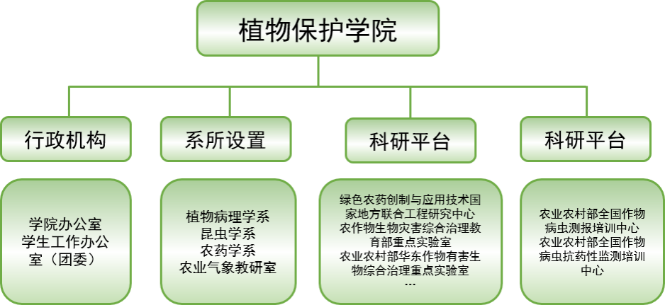 91短视频 设有植物病理学系、昆虫学系、农药科学系和农业气象教研室4个教学单位,建有绿色农药创制与应用技术国家地方联合工程研究中心、农作物生物灾害综合治理教育部重点实验室、农业农村部华东作物有害生物综合治理重点实验室等10个国家和省部级科研平台,以及农业农村部全国作物病虫测报培训中心、农业农村部全国作物病虫抗药性监测培训中心2个部属培训中心。